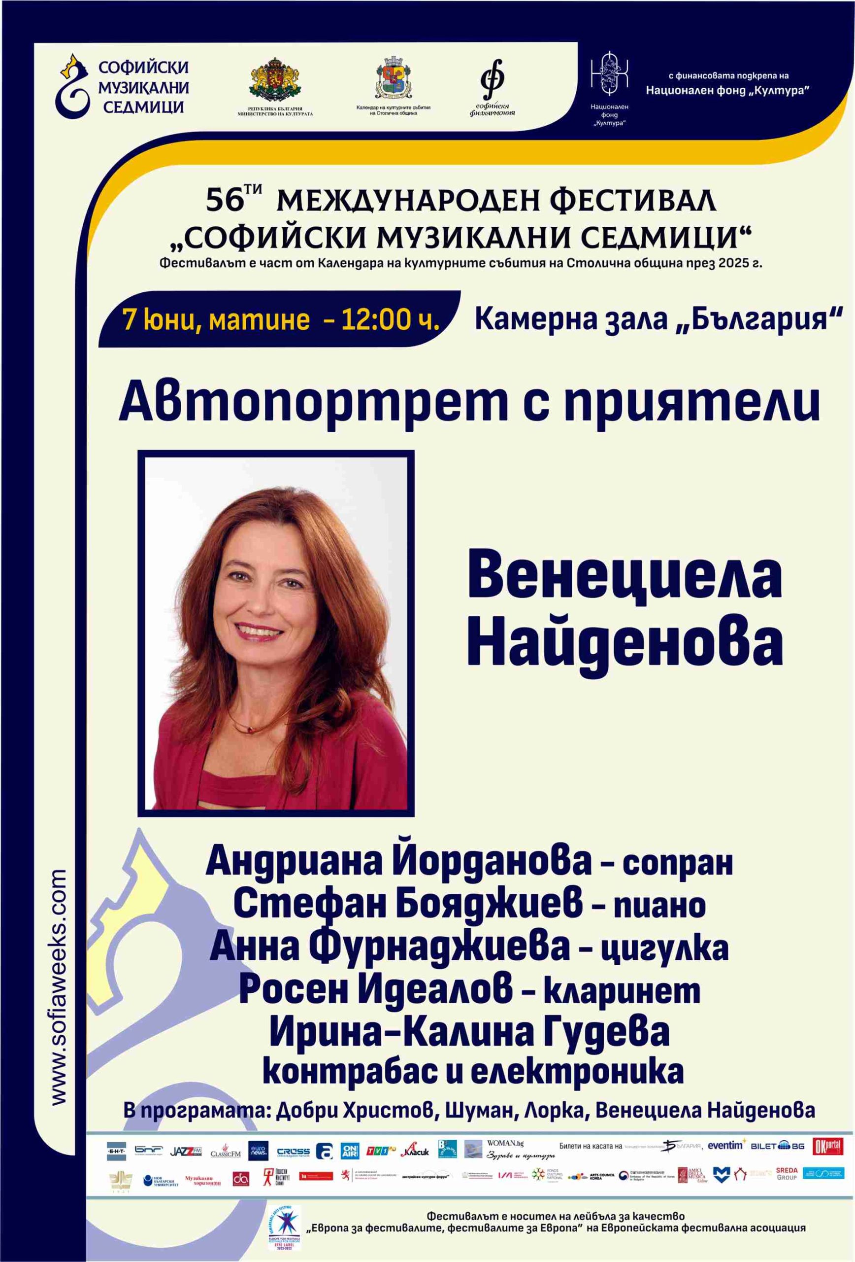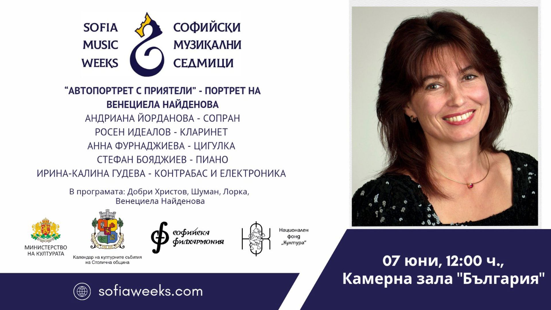 матине – “Автопортрет с приятели” на Венециела Найденова. Участват и Стефан Бояджиев – пиано, Анна Фурнаджиева – цигулка, Андриана Йорданова – сопран, Росен Идеалов – кларинет, Ирина-Калина Гудева – контрабас и електроника. В програмата: Добри Христов, Шуман, Лорка, Венециела Найденова.