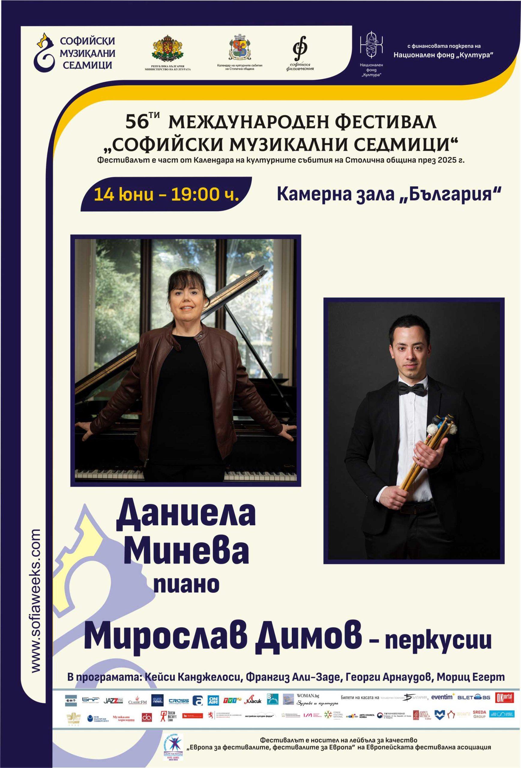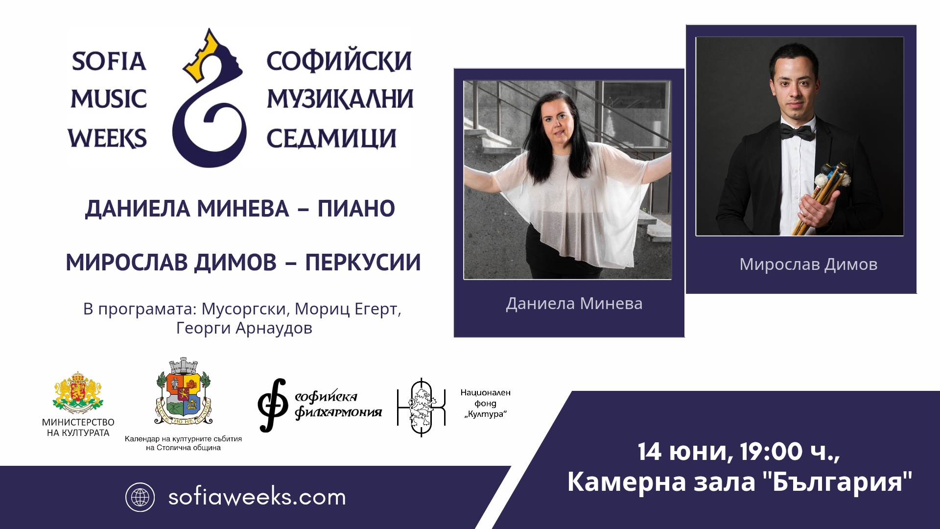 Даниела Минева – пиано и Мирослав Димов – перкусии. В програмата: Мусоргски, Мориц Егерт, Георги Арнаудов.