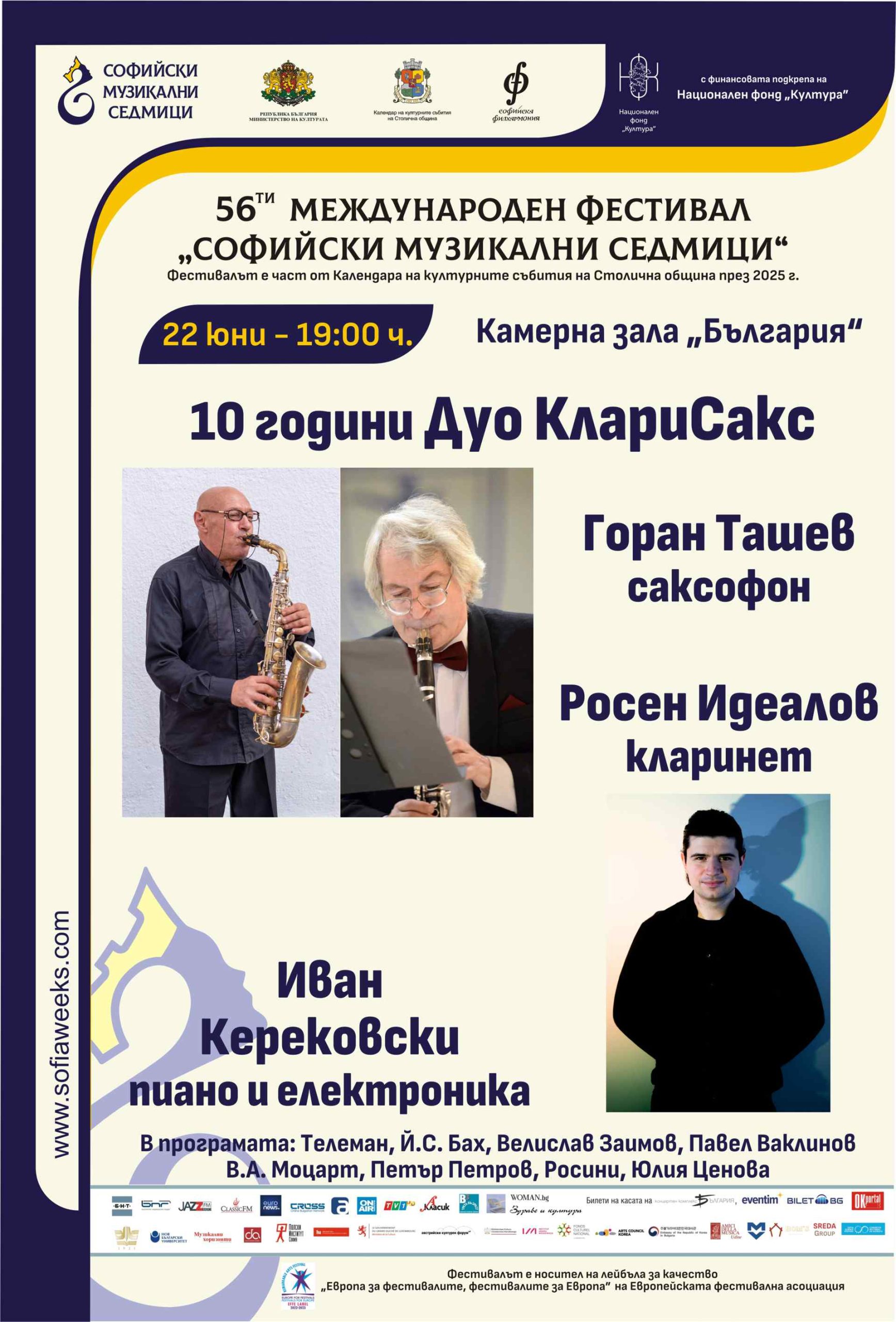 Дуо „КлариСакс“ (Росен Идеалов – кларинет и Горан Ташев – саксофони) и Иван Керековски – пиано и електроника. В програмата: Телеман, Й.С. Бах, Велислав Заимов, Павел Ваклинов, В.А. Моцарт, Петър Петров, Росини, Юлия Ценова.