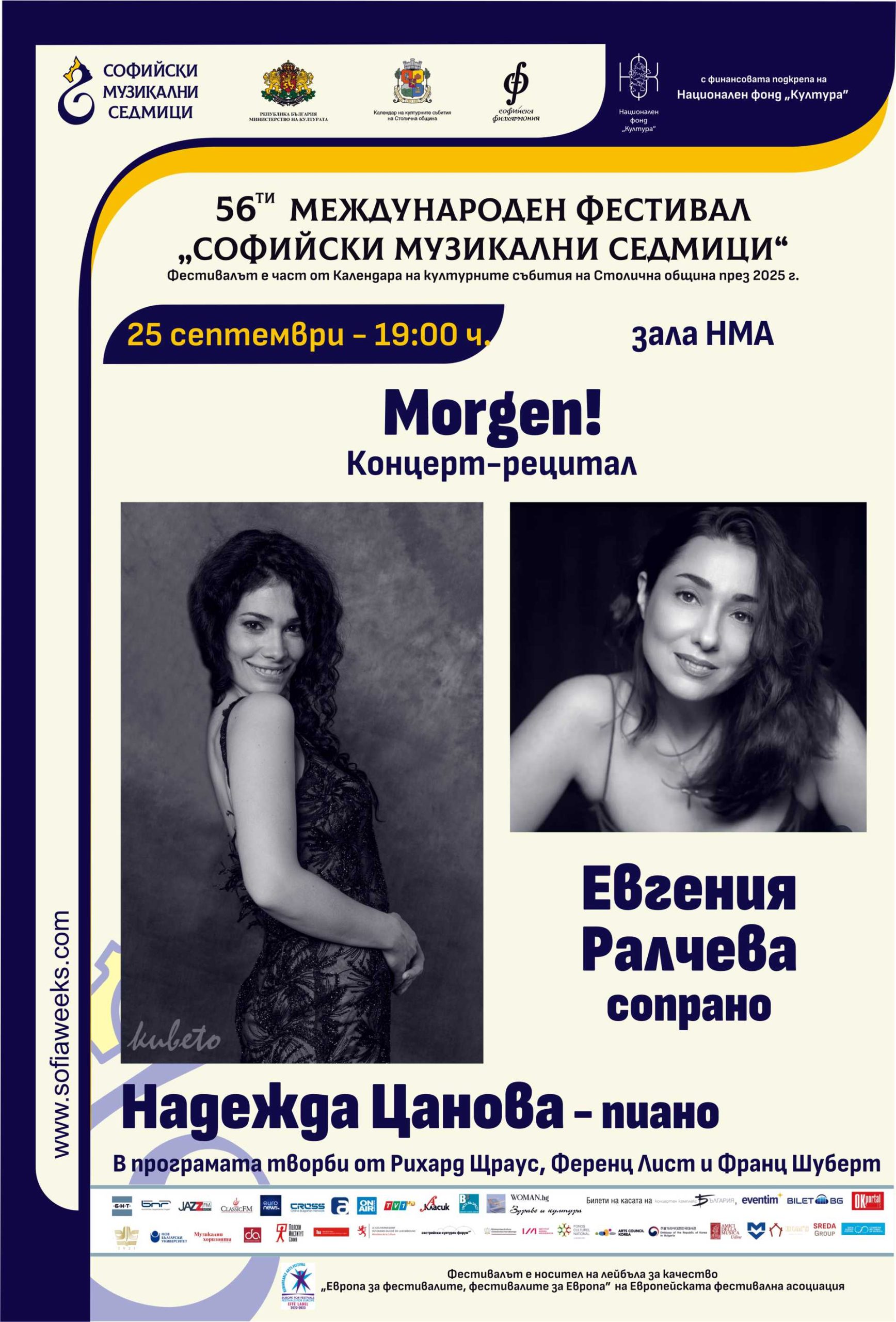 Вокален рецитал на Евгения Ралчева – сопрано и Надежда Цанова – пиано. В програмата: песни от Рихард Щраус и Ференц Лист