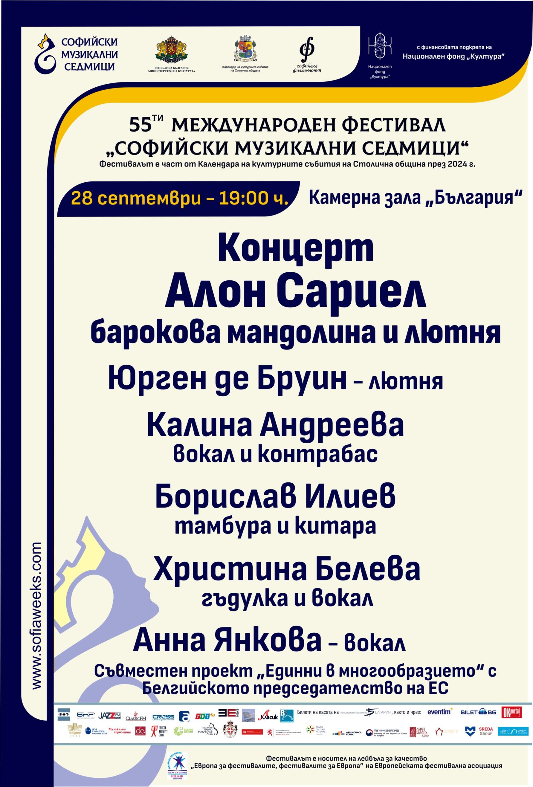 Камерна зала „България“ – Концерт на Алон Сариел – барокова мандолина и лютня, Юрген де Бруин – лютня, Калина Андреева – вокал и контрабас, Борислав Илиев – тамбура и китара, Христина Белева – гъдулка и вокал, Анна Янкова – сопран. Съвместен проект „Единни в многообразието“ с Белгийското председателство на ЕС.