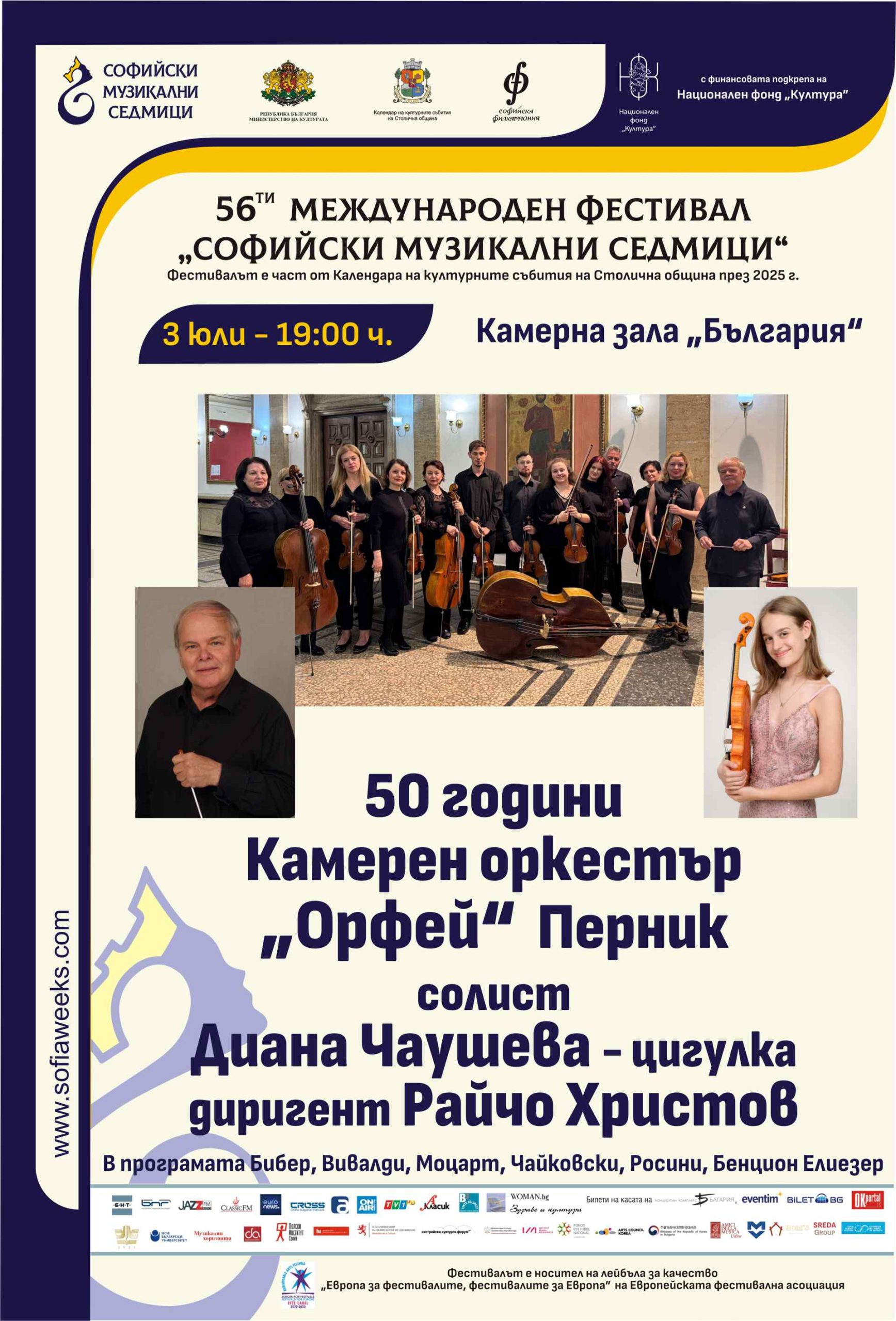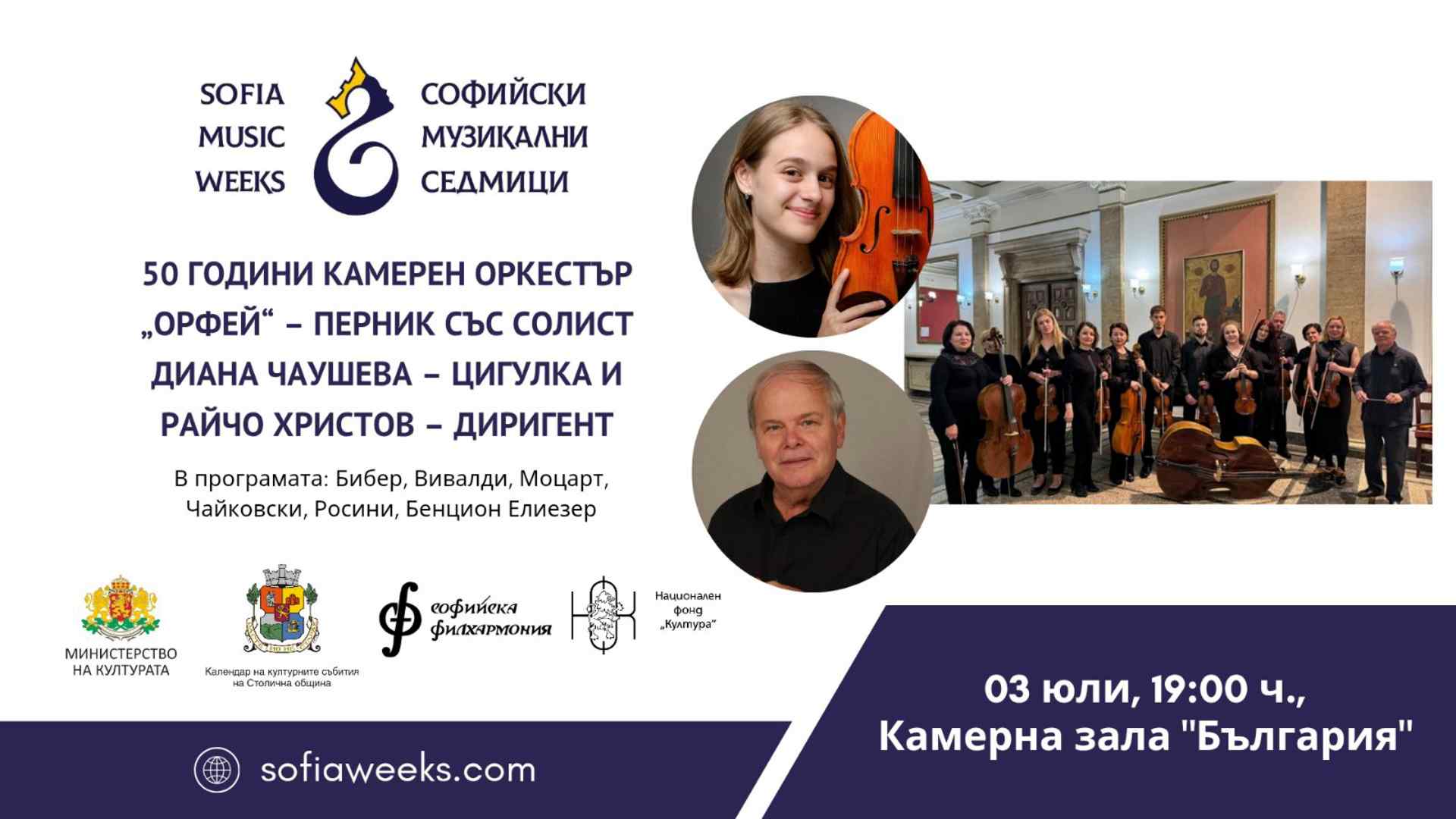 50 години Камерен оркестър „Орфей“ – Перник със солист Диана Чаушева – цигулка и диригент Райчо Христов. В програмата Бибер, Вивалди, Моцарт, Чайковски, Росини, Бенцион Елиезер.