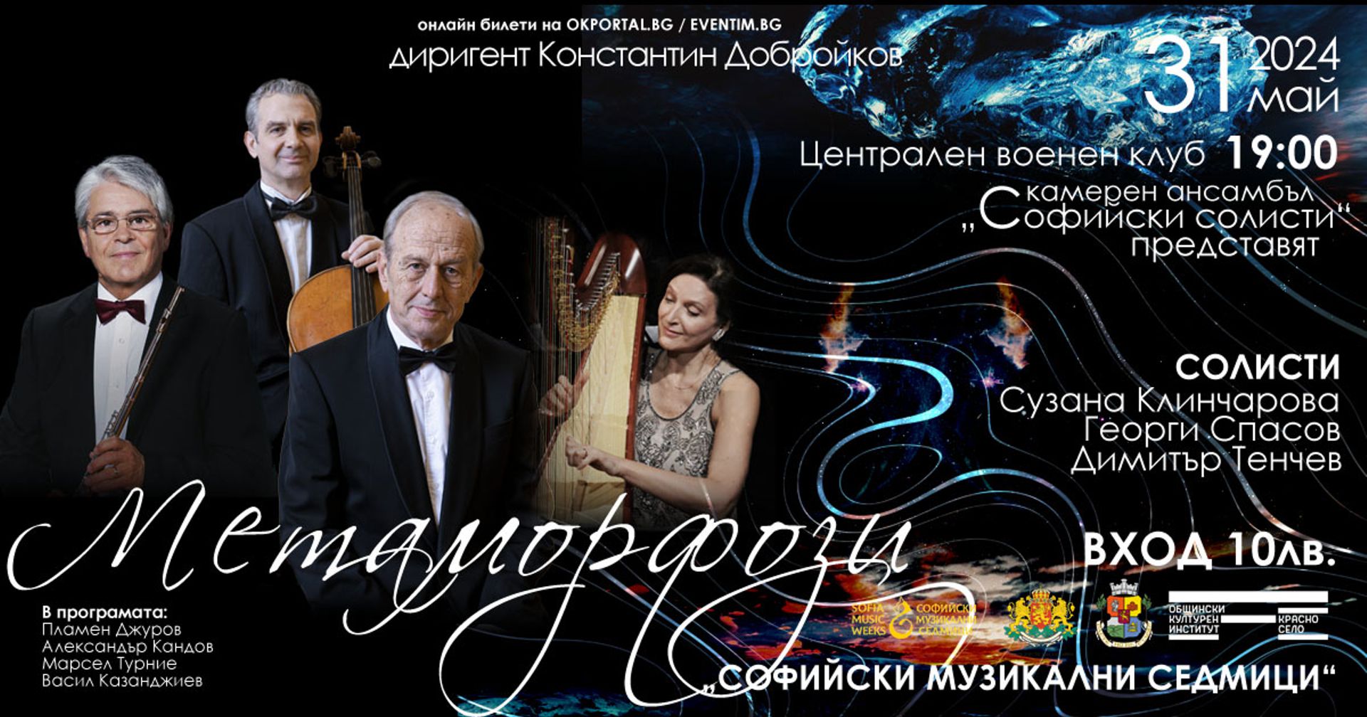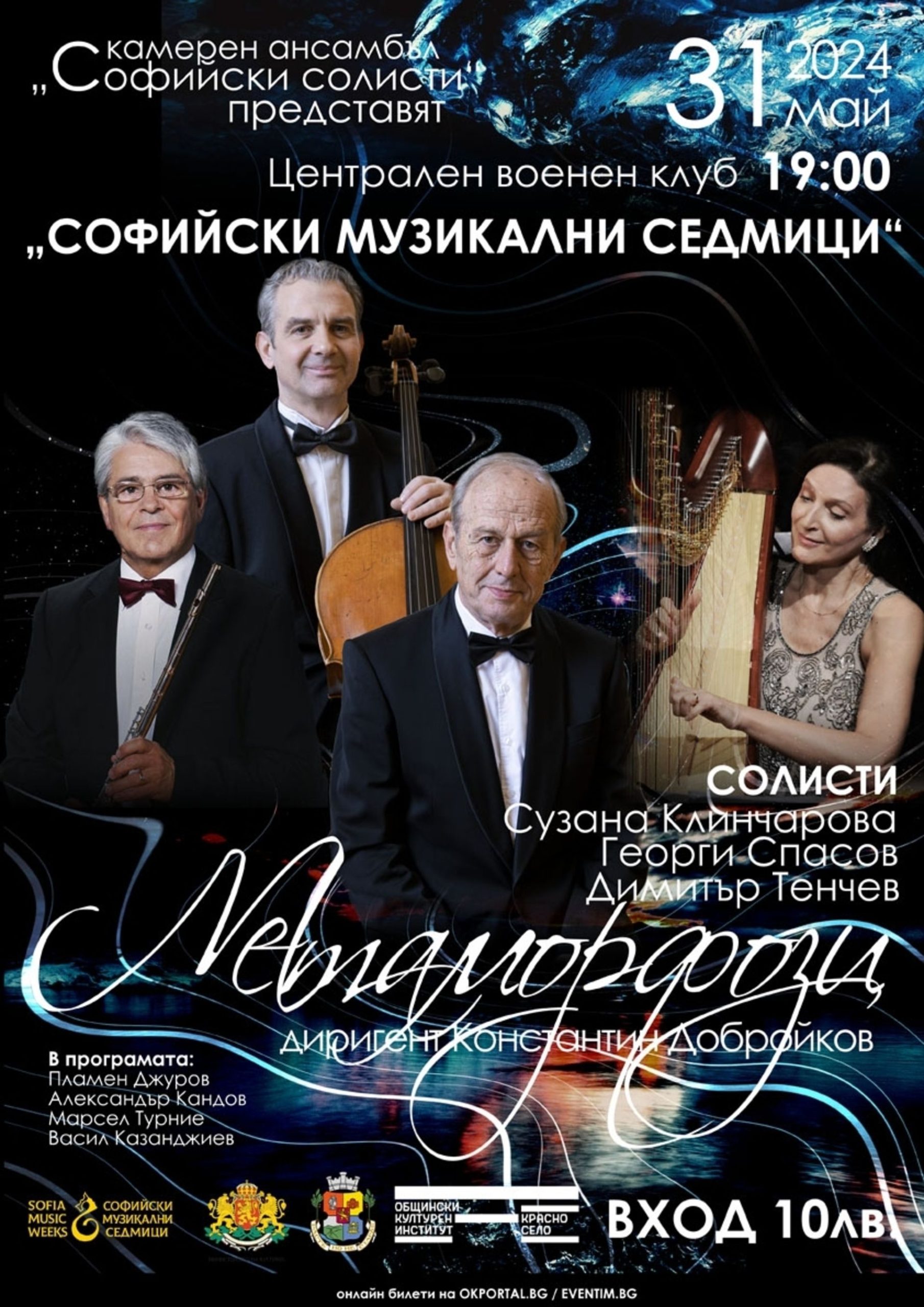 КА „Софийски солисти“ със солист Сузана Клинчарова – арфа, Георги Спасов – флейта и Димитър Тенчев – виолончело, диригент Константин Добройков.