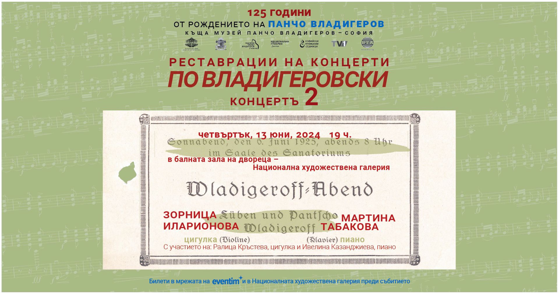 Втори концерт от поредицата „По Владигеровски“ – вечер с творби на Панчо Владигеров с участието на Зорница Иларионова – цигулка и Мартина Табакова – пиано. Ралица Кръстева – цигулка и Ивелина Казанджиева – пиано.