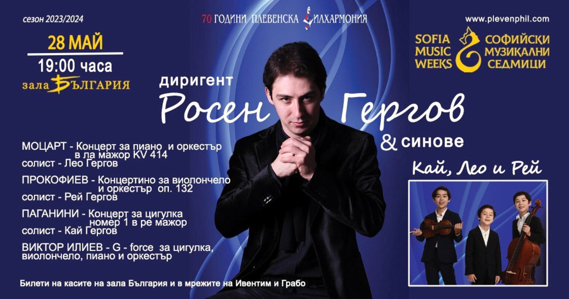 Плевенска филхармония с концерт „Росен Гергов&синове“. Солисти: Лео Гергов – пианоРей Гергов – виолончево, Кай Гергов – цигулка, диригент Росен Гергов