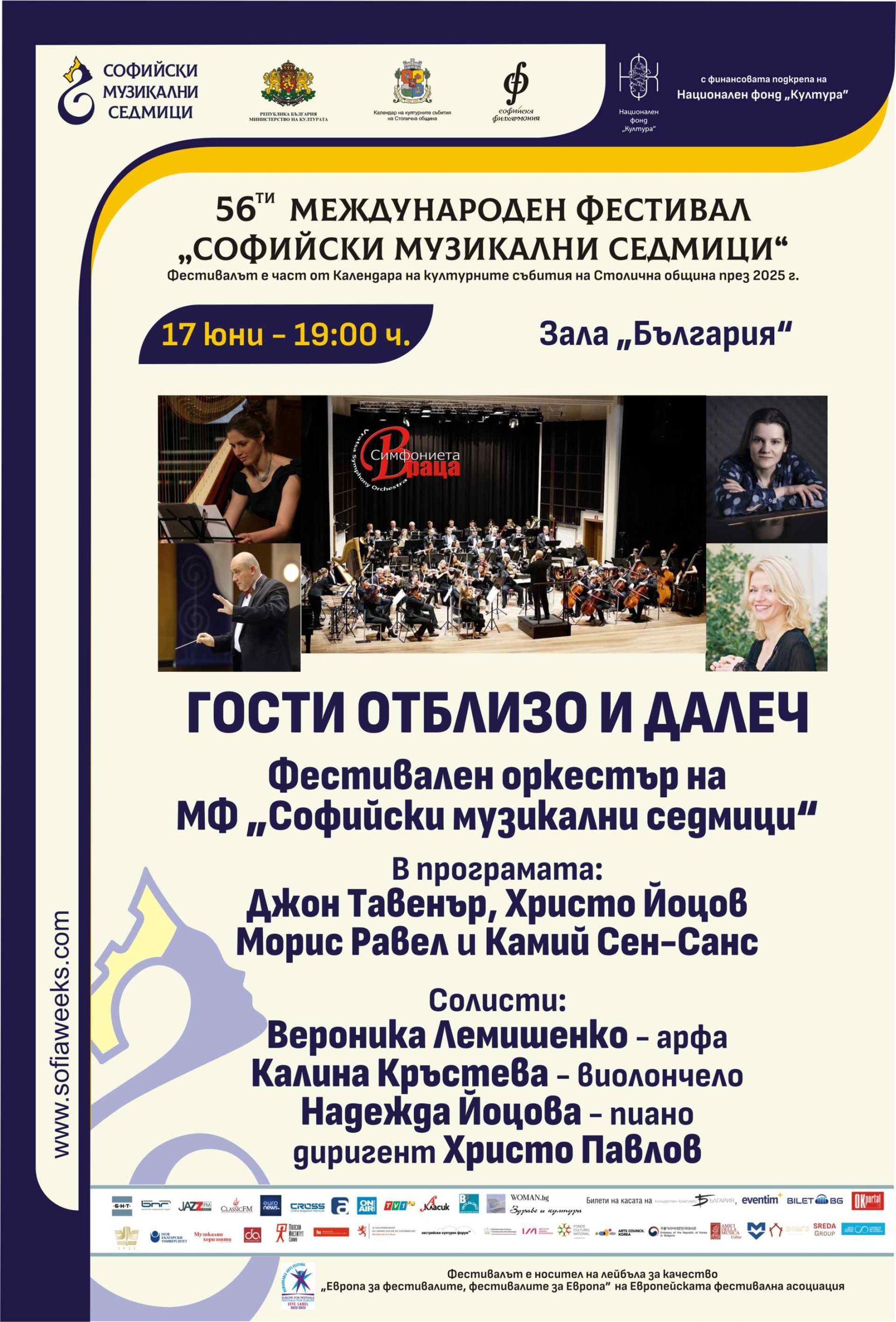 Фестивален оркестър на МФ „Софейски музикални седмици“ с премиери на Джон Тавенър и Христо Йоцов, и творби на Морис Равел и Камий Сен-Санс. Солисти: Вероника Лемишенко – арфа, Калина Кръстева – виолончело, Надежда Йоцова – пиано, диригент Христо Павлов.