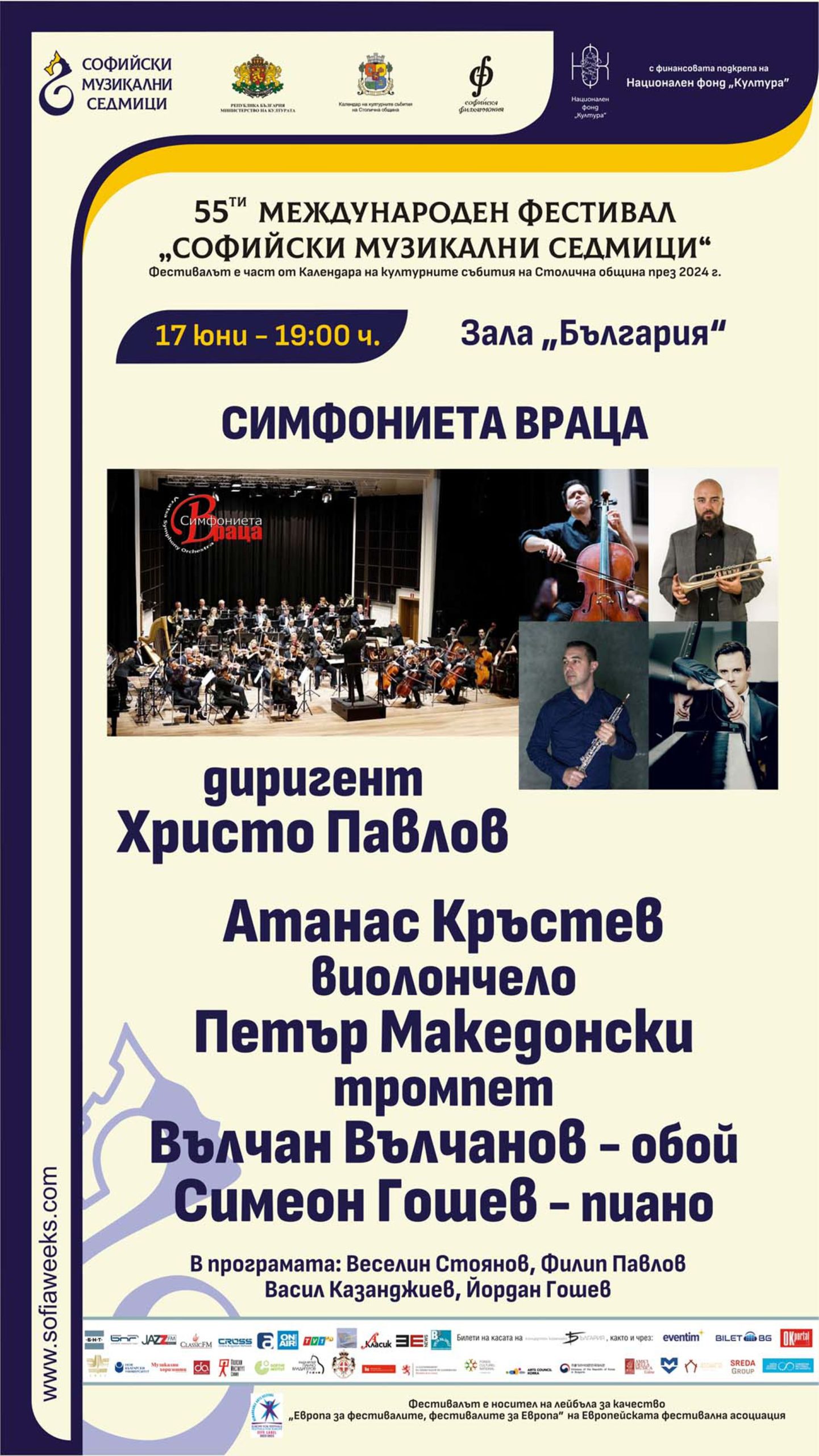 Симфониета Враца с диригент Христо Павлов, солисти – Атанас Кръстев – виолончело, Петър Македонски – тромпет, Вълчан Вълчанов – обой, Симеон Гошев – пиано.