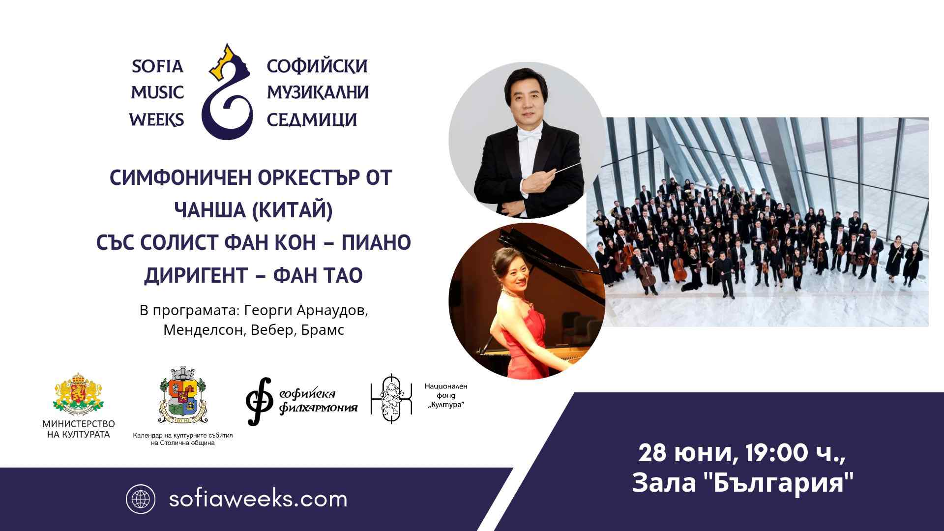 Симфоничен оркестър от Чанша със солист Фан Кон – пиано и диригент Фан Тао. В програмата: Георги Арнаудов, Менделсон, Вебер, Брамс.
