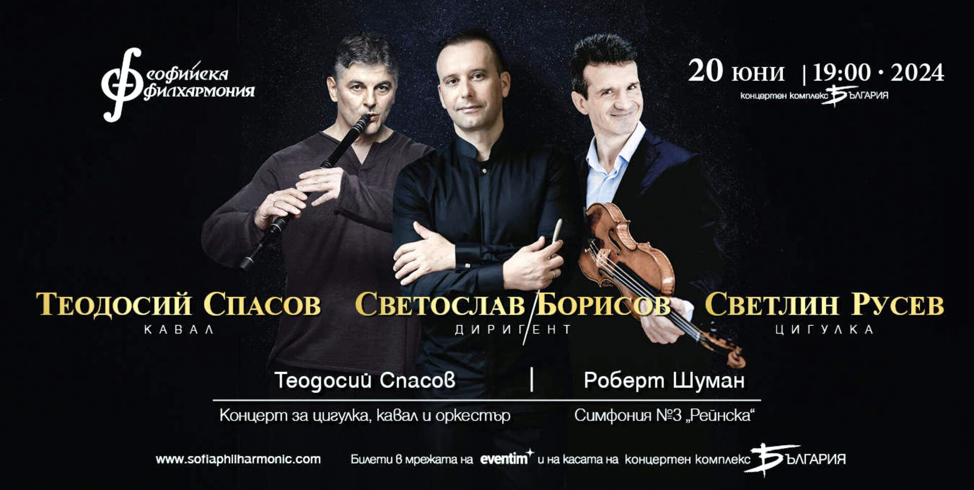 Софийска филхармония със солисти Светлин Русев – цигулка и Теодосий Спасов – кавал, диригент Светослав Борисов.