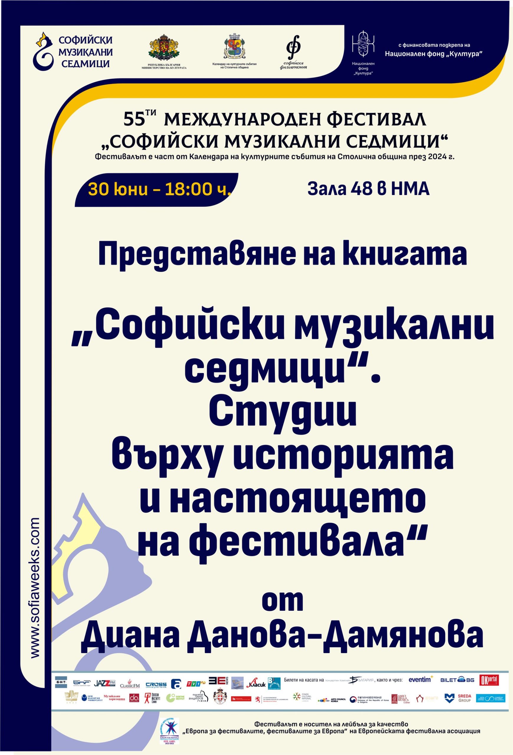 На 30 юни 2024 година (неделя) от 18.00 ч. в Зала № 48 на Националната музикална академия „Проф. Панчо Владигеров“ ще бъде представянето на „Софийски музикални седмици – Студии върху историята и настоящето на фестивала“ от Диана Данова-Дамянова.