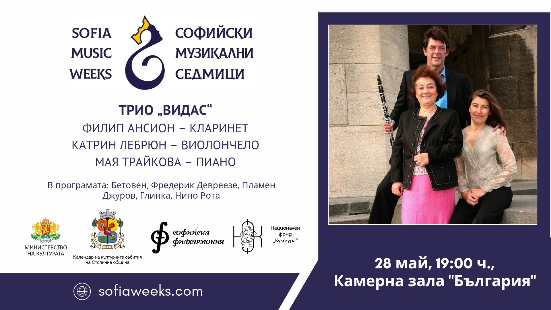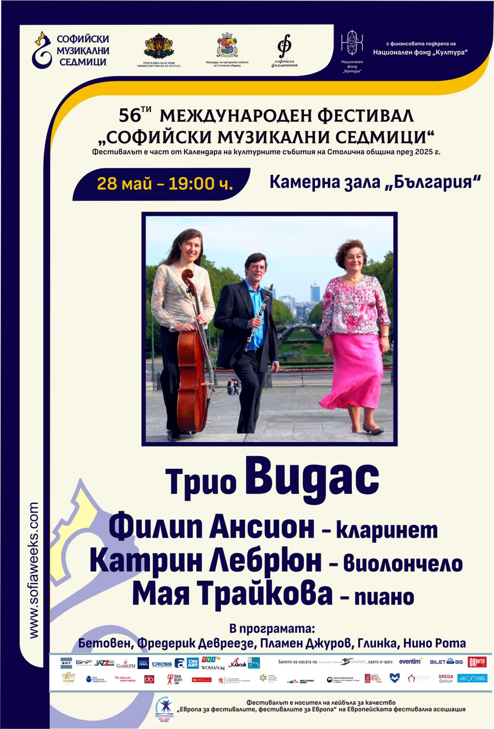 Трио „Видас“ – Филип Ансион – кларинетКатрин Лебрюн – виолончело, Мая Трайкова – пиано. В програмата: БетовенФредерик ДевреезеПламен Джуров, Глинка, Нино Рота.