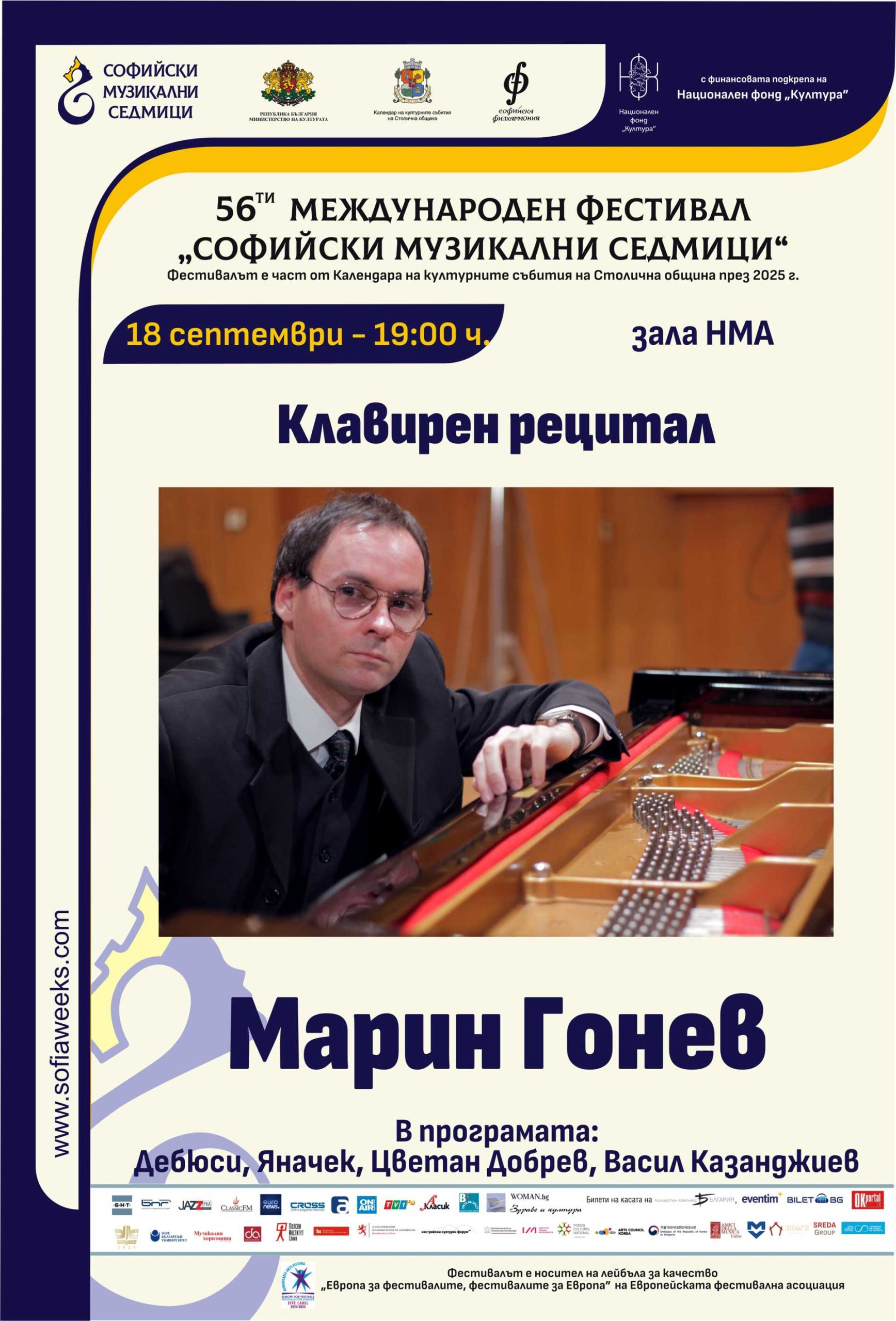 Клавирен рецитал на Марин Гонев. В програмата: Дебюси, Яначек, Цветан Добрев, Васил Казанджиев.