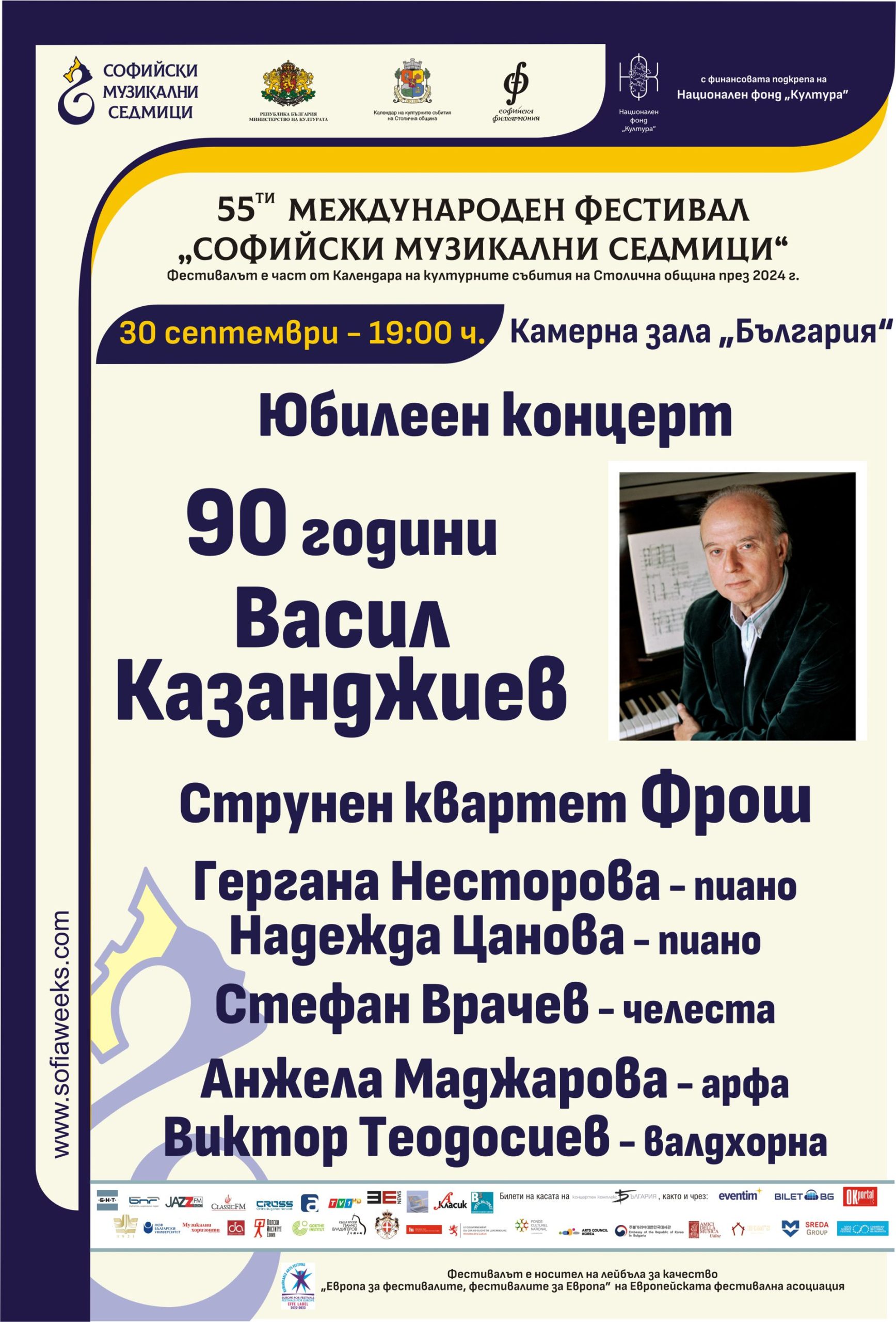 Юбилеен концерт за 90 г. Васил Казанджиев – квартет „Фрош“, Гергана Несторова, Надежда Цанова и Стефан Врачев – пиано, Анжела Маджарова – арфа, Виктор Теодосиев – валдхорна.