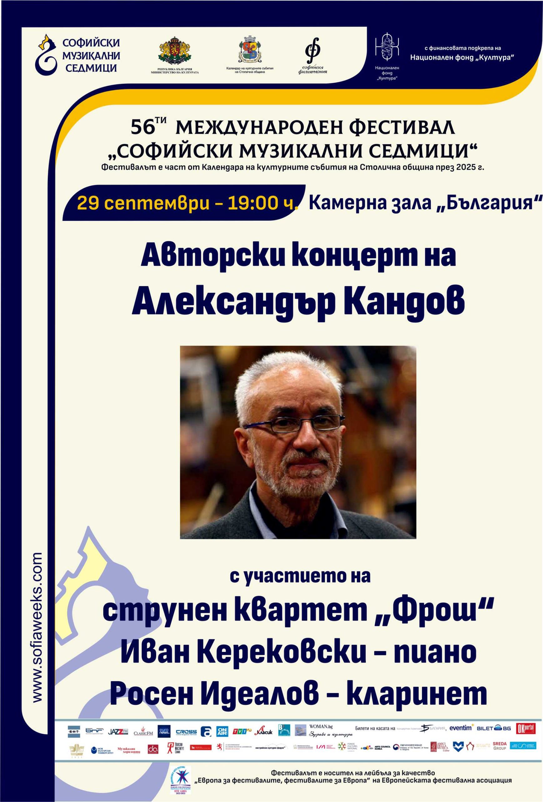 Авторски концерт на Александър Кандов. С участието на струнен квартет „Фрош“, Иван Керековски – пиано, Росен Идеалов – кларинет.