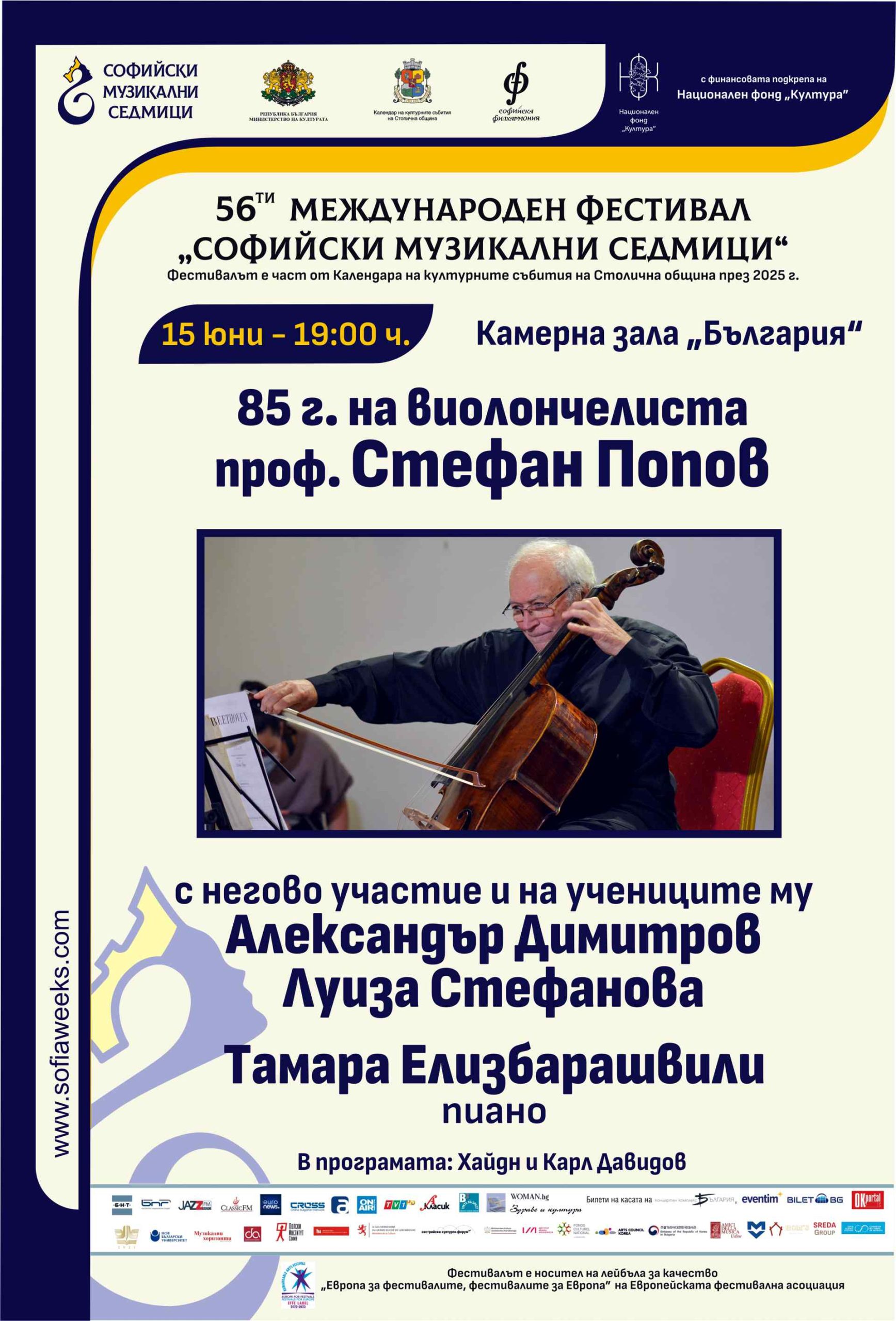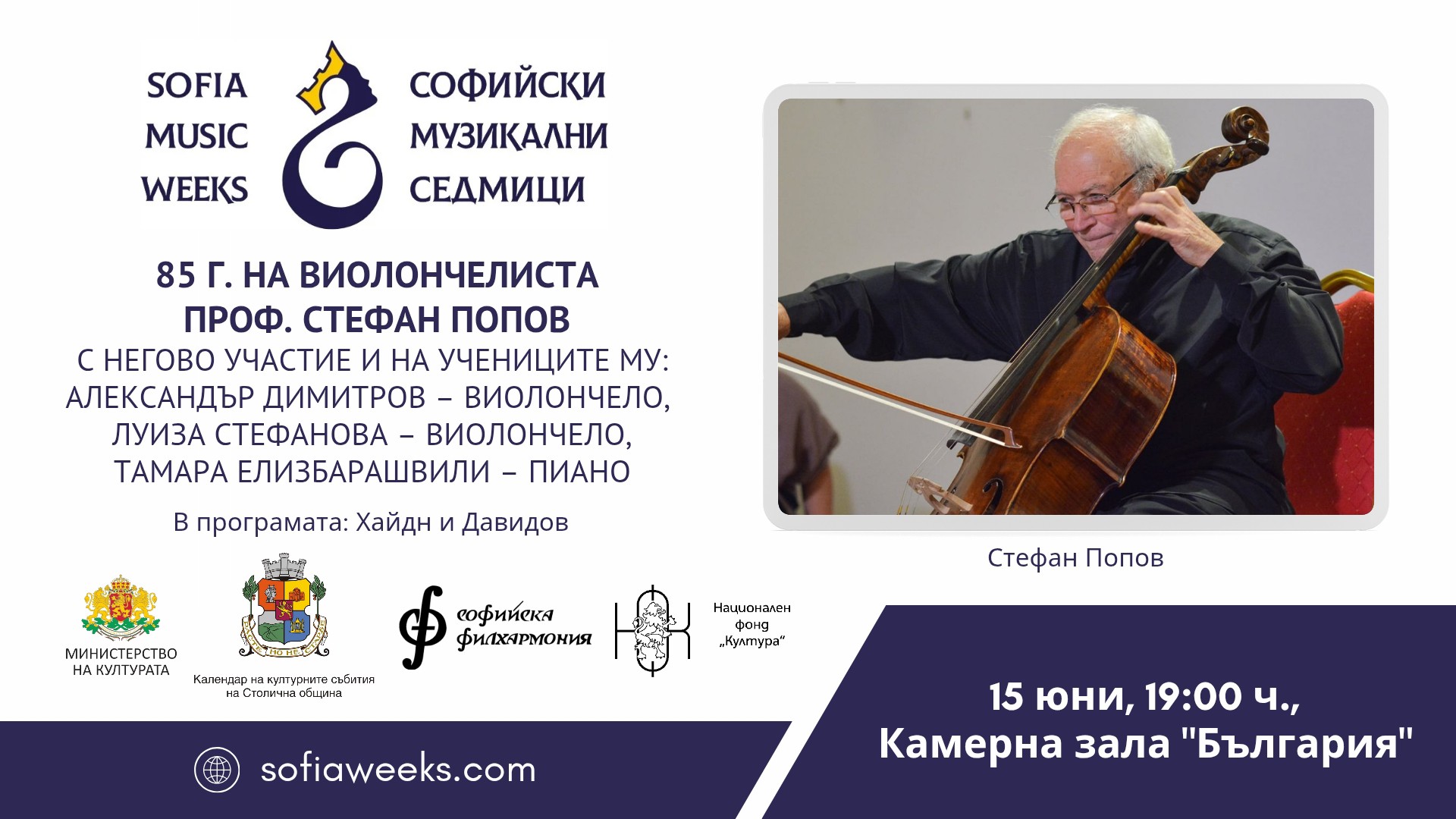 85 г. на виолончелиста проф. Стефан Попов, с негово участие и на учениците му Александър Димитров и Луиза Стефанова и Тамара Елизбарашвили – пиано. В програмата: Хайдн и Карл Давидов.